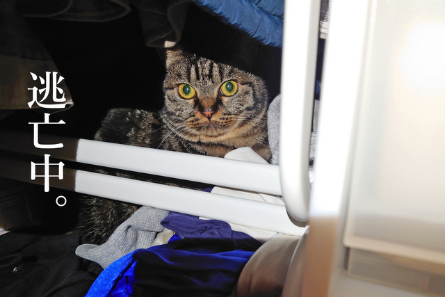 ちなみにクローゼットは閉まっていたのに開けて入って引き出しに入っていました。あらあら、落ち着いてますね…。見つかっても慌てるでもなくじっとしているウズちゃん。