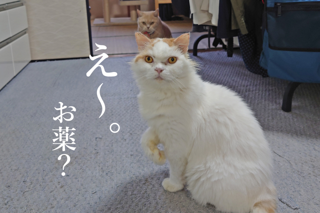 DSC_0154mc-001本番のお留守番も少し逃げたものの出てきてくれて、お薬入りの食事を提供。それほど嫌がるでもなく、なんとかお薬も一緒に食べていただきました!